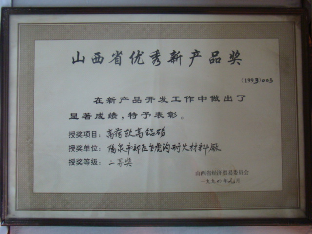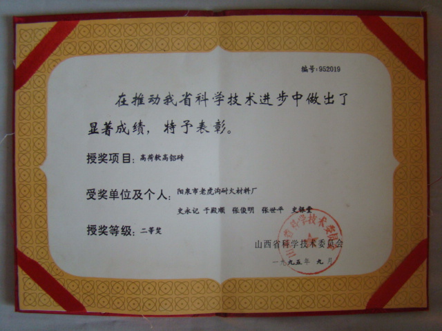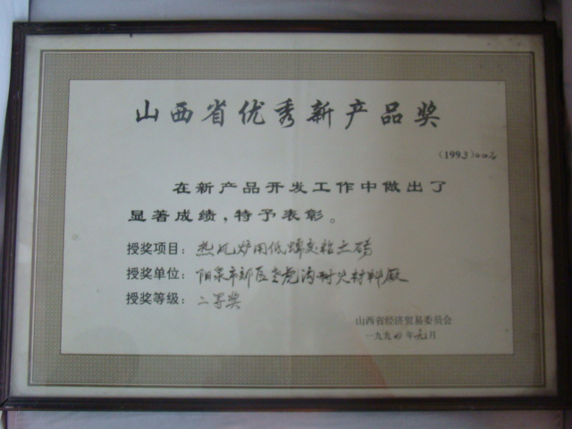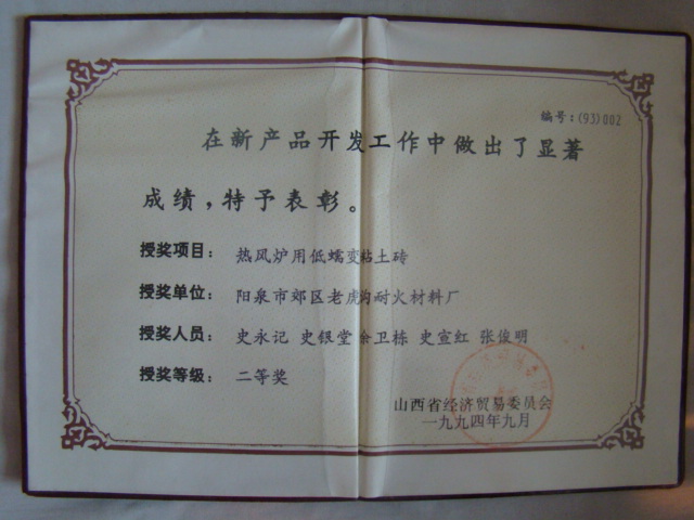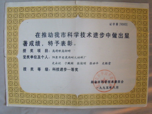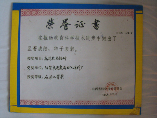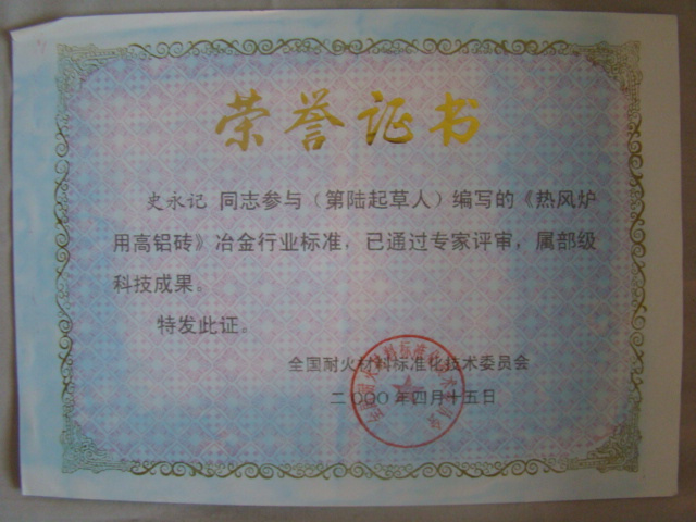 熱風(fēng)爐用低蠕變高鋁磚、高荷軟高鋁磚獲省科技進(jìn)步二等獎,微膨脹高鋁磚列入火炬計劃項(xiàng)目,炭素焙燒爐用特種高鋁磚已批準(zhǔn)國家專利